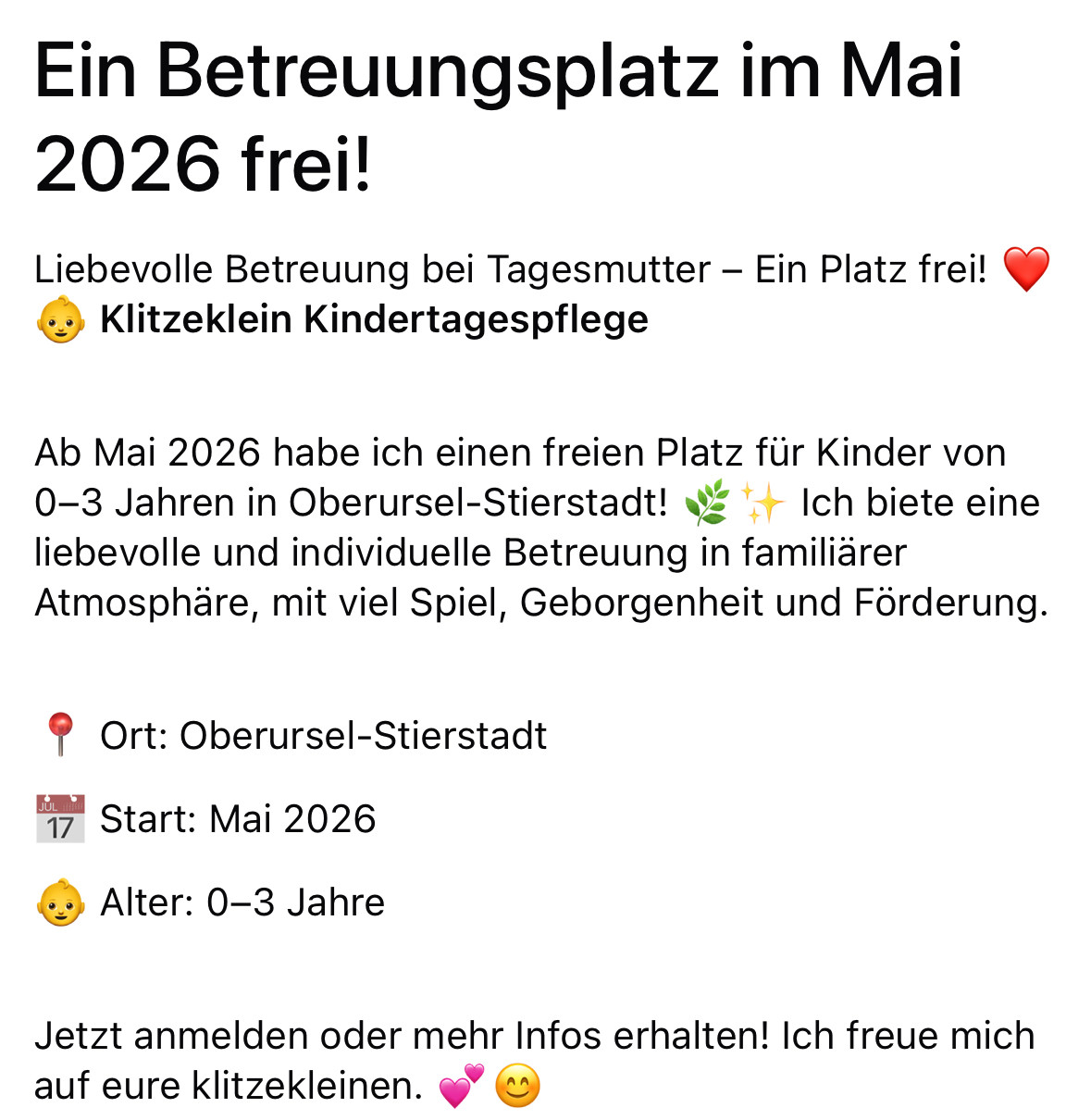 Die moderne Herausforderung, Familie und Beruf zu vereinen, erfordert individuelle Lösungen. In Zeiten veränderter Wohn- und Lebenssituationen möchte ich Eltern dabei unterstützen. Kinder brauchen ein soziales Umfeld, um optimal aufzuwachsen. Finden Sie gemeinsam mit mir die passende Betreuungsform für Ihre Familie und Ihr Kind.