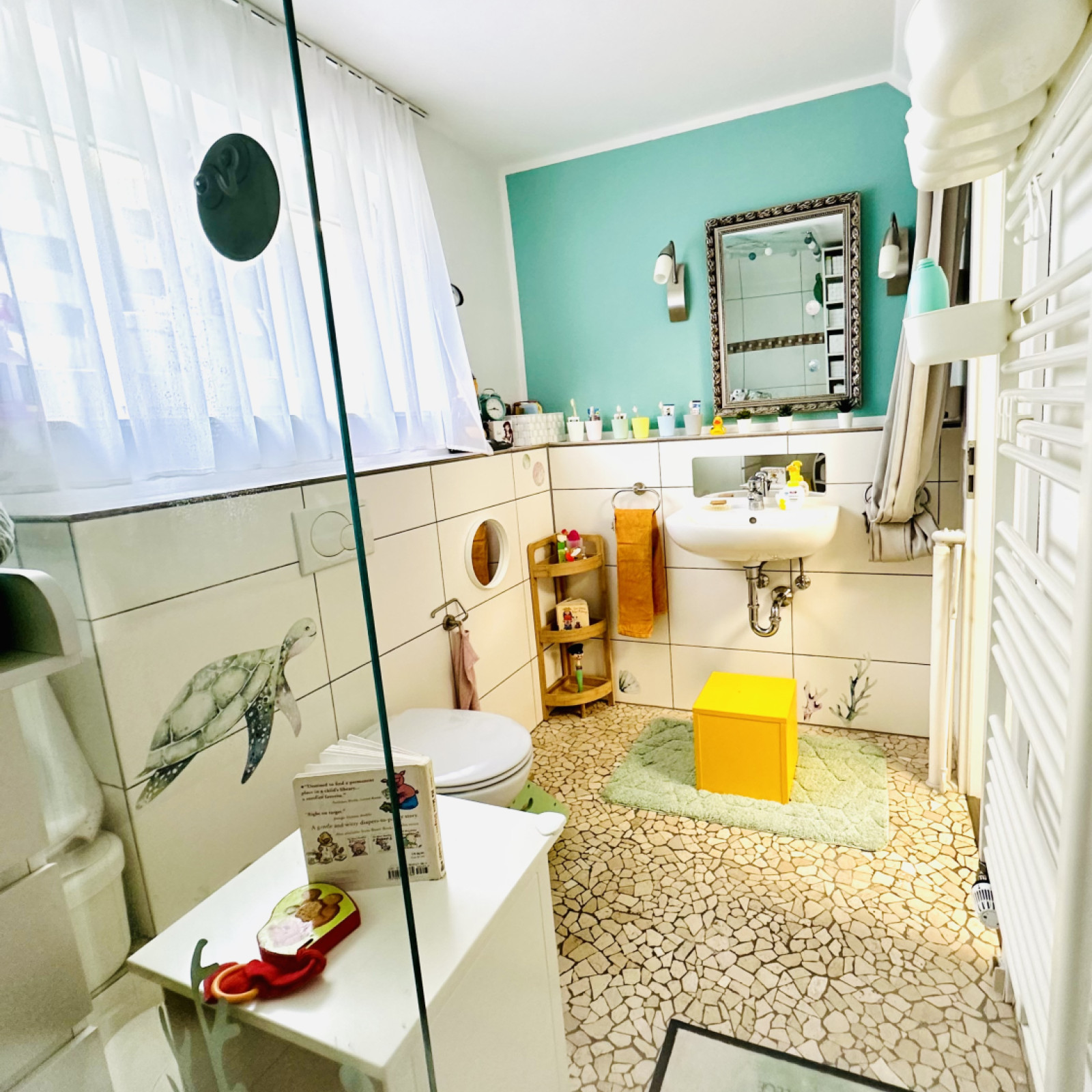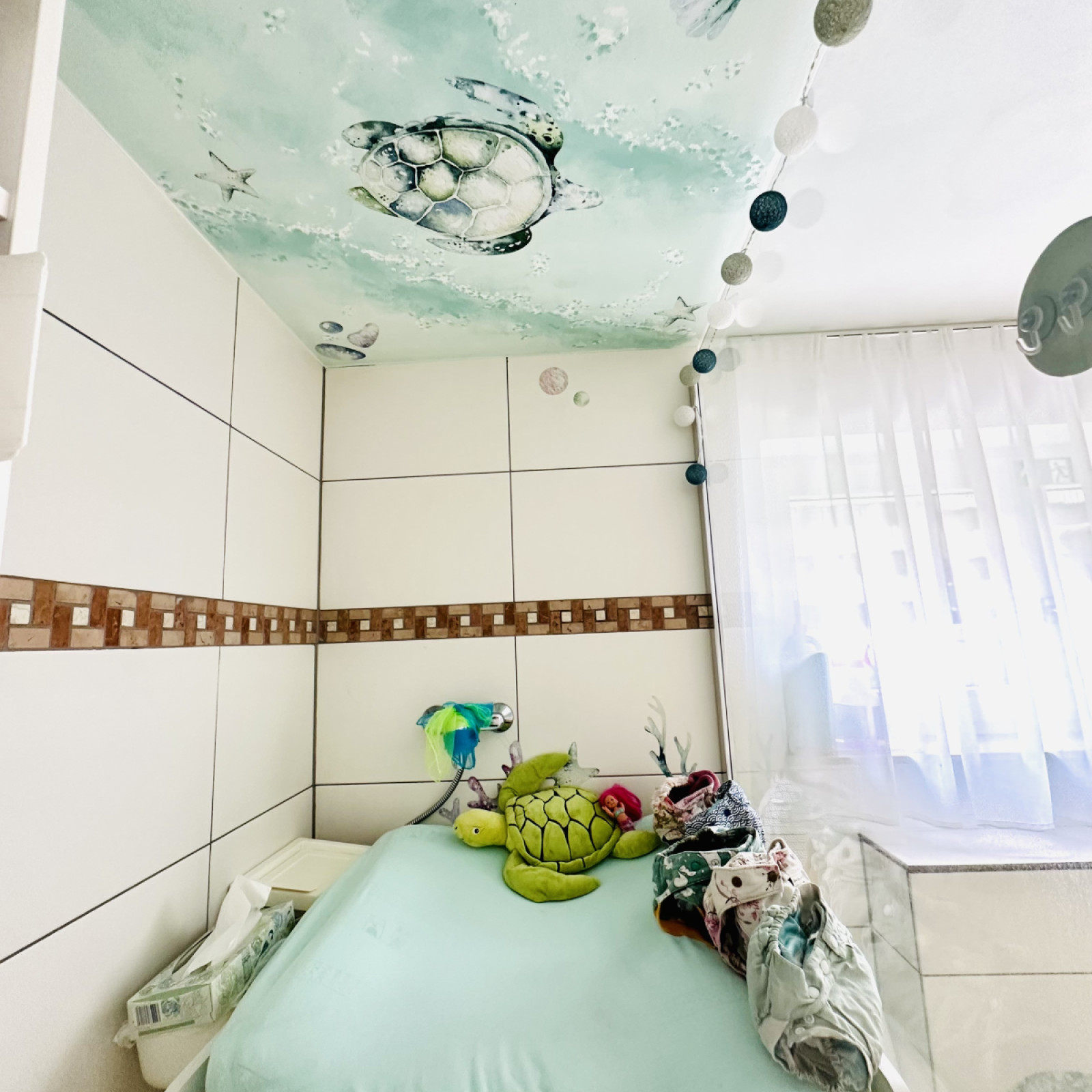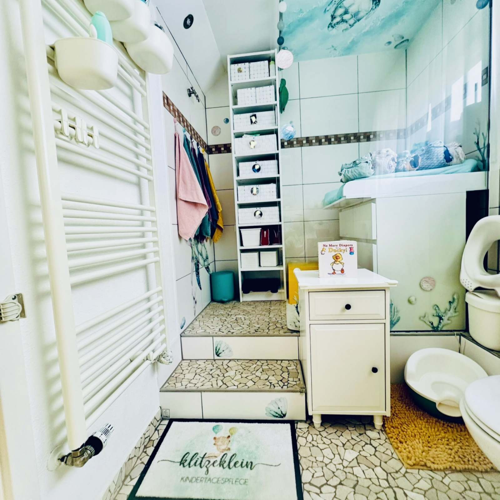geräumiges Badezimmer mit Wickelmöglichkeit in einer Unterwasserwelt. Das