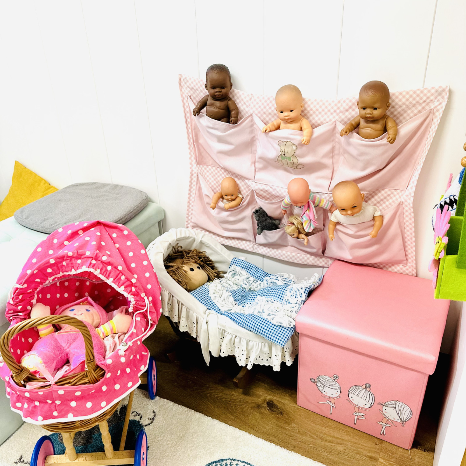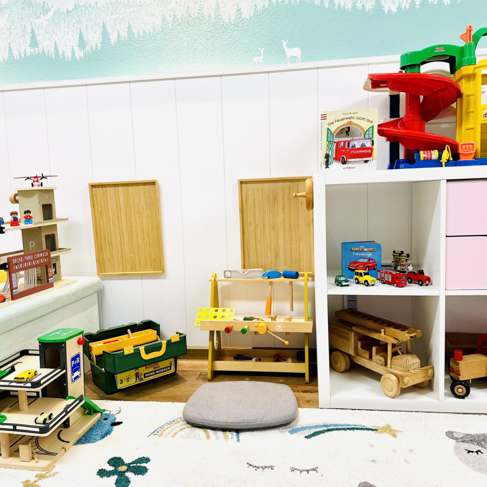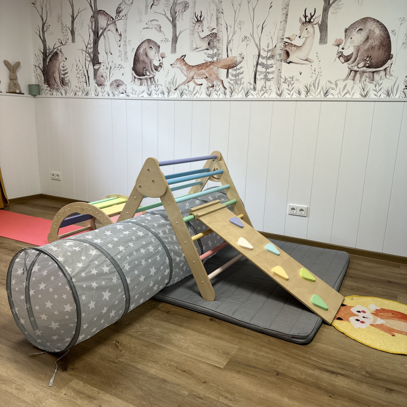 Spielen ermöglichen. Die farbenfrohe Raumgestaltung in Pastell- und Erdtönen